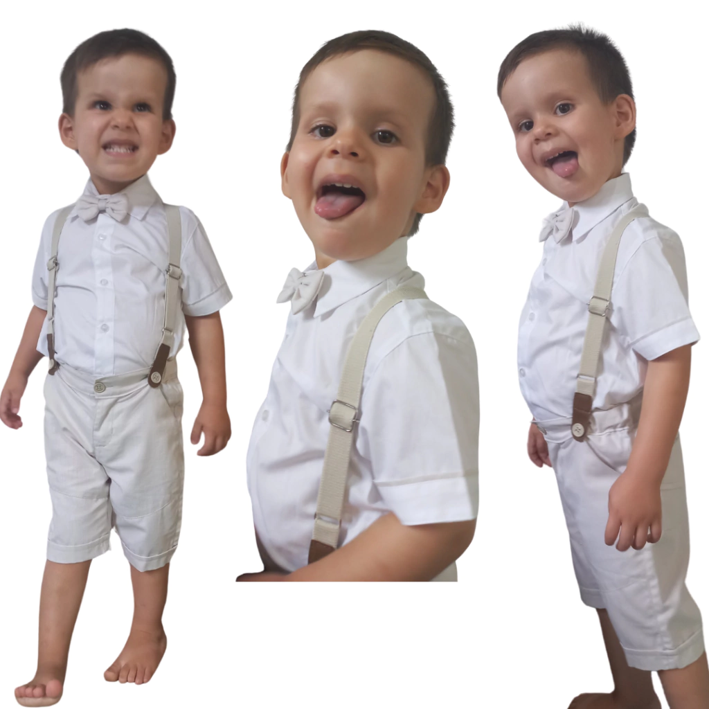 Conjunto Infantil Social Menino Camisa Curta com Suspensório Bermuda e Gravata Borboleta Cor Bege 1 e 2 anos.